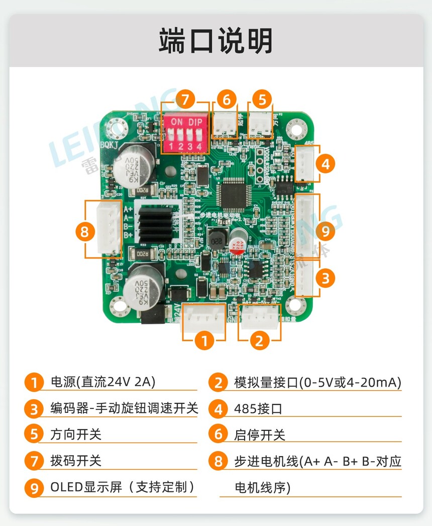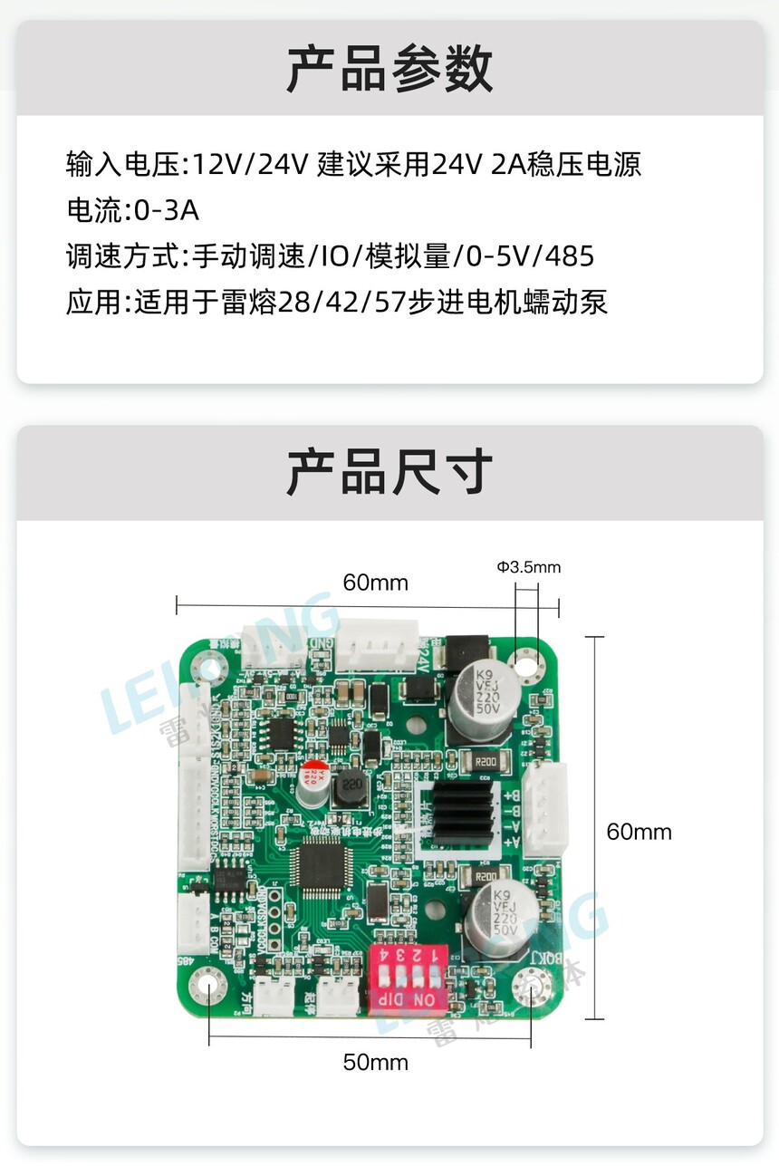 调速方式:手动调速/0/模拟量/0-5V/485应用:适用于雷熔28/42/57步进电机蠕动泵